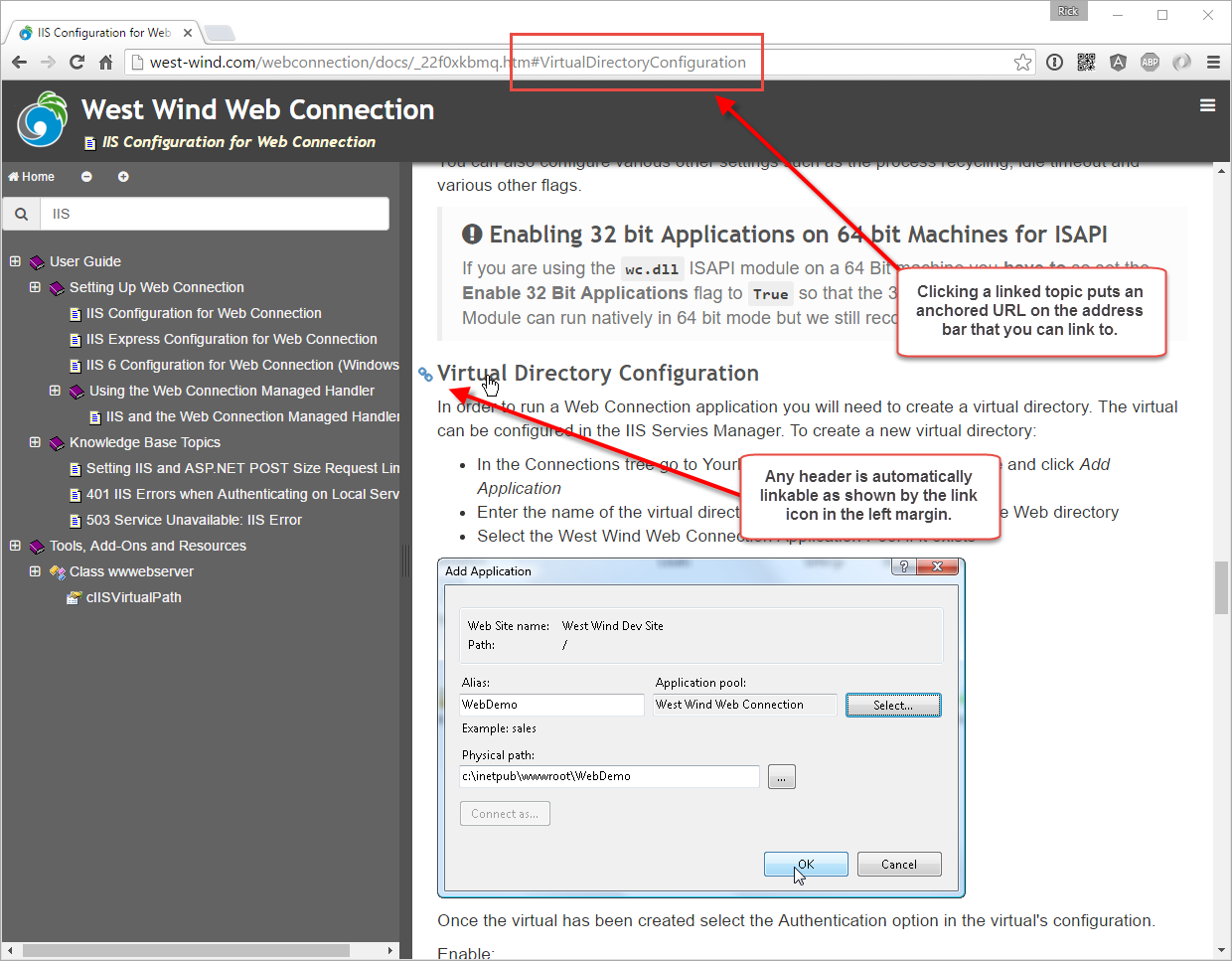 West Wind Html Help Builder makes it easy to link to documentation topics via the direct page link. When you link to a topic that topic is brought up in context and with the topic tree preselected for the topic selected.