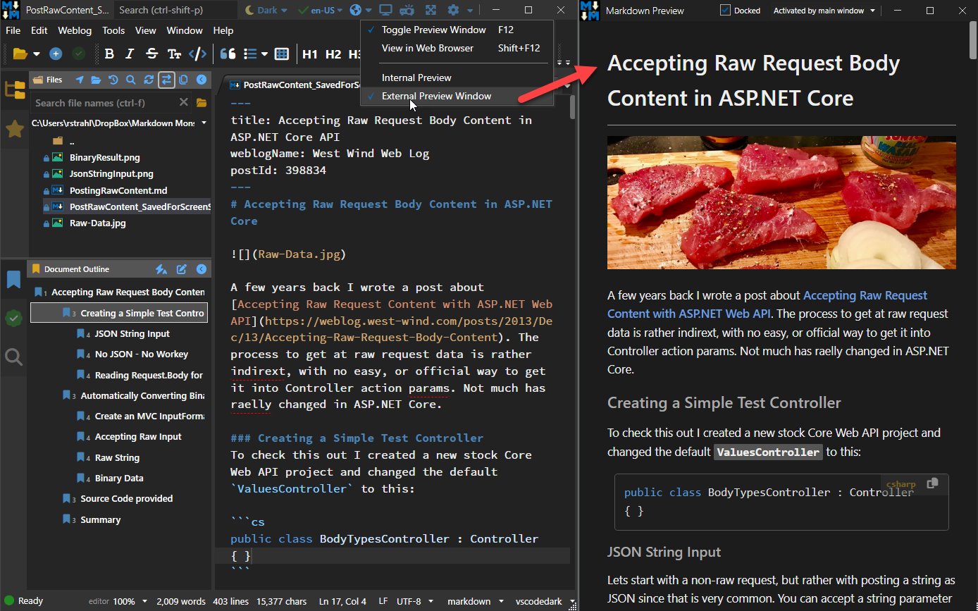 Note too that you can use the previewer with a separate detachable window so you can move the window around which is one of the reasons you might be wanting to use an external browser.